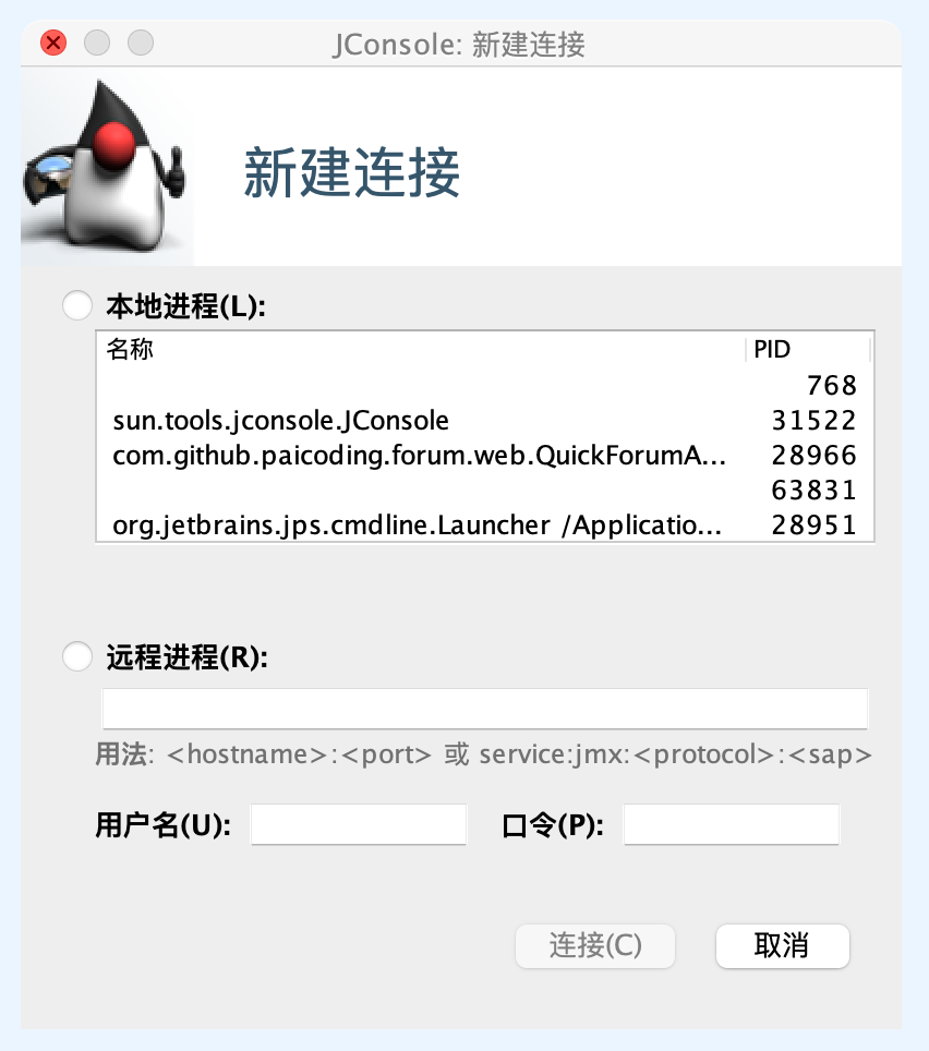 直接启动 JConsole,会弹出一个窗口,显示本机正在运行的 Java 程序,选择一个程序(比如说技术派的 28966),点击连接即可。