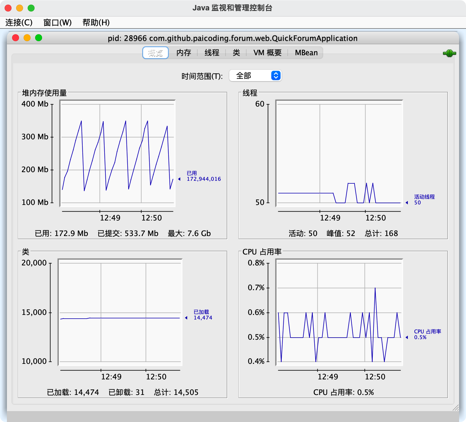 使用 JConsole 连接了一个本地程序,在概述可以看到 Java 程序的运行时概况,包括堆内存使用量、线程、类、CPU占用率四项信息的曲线图。