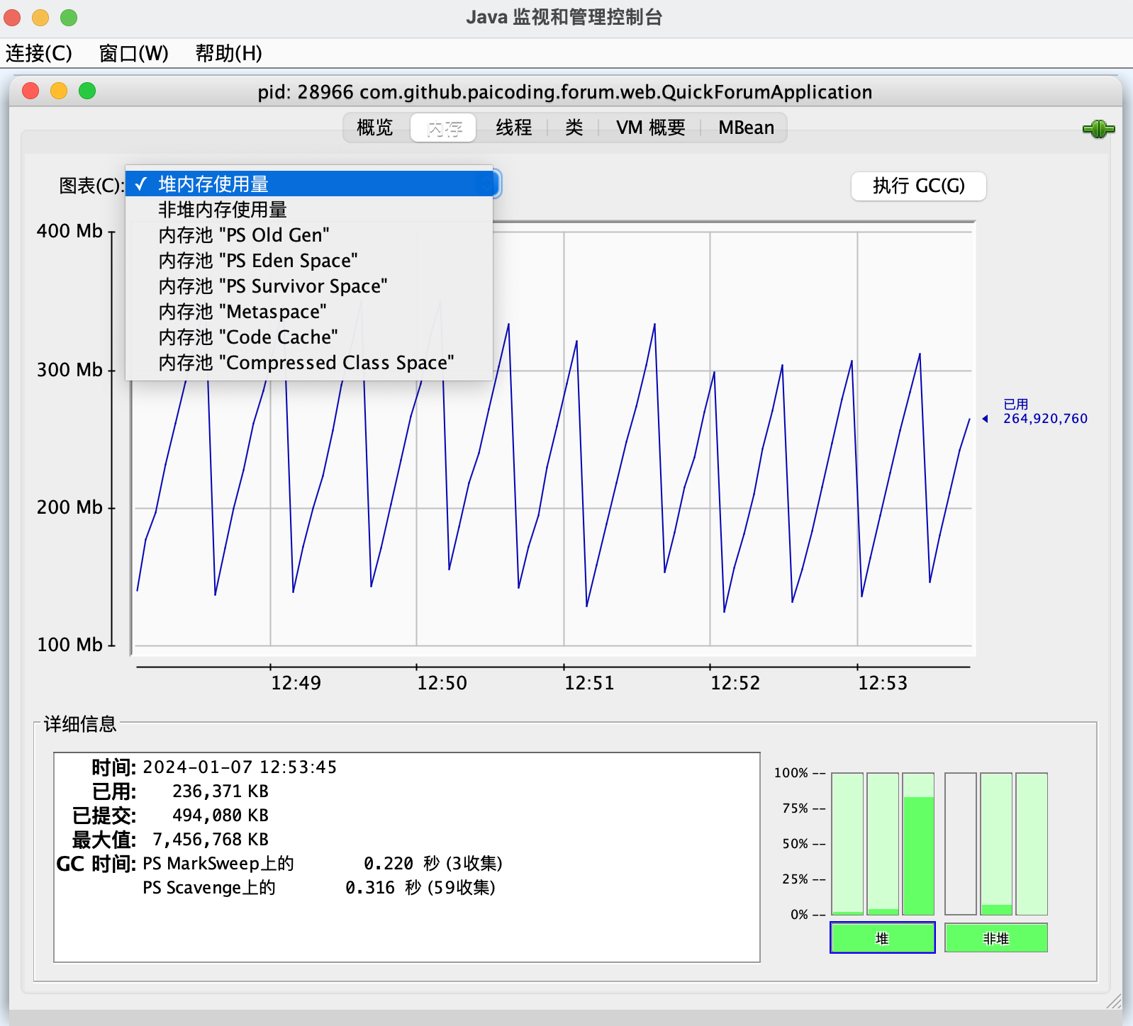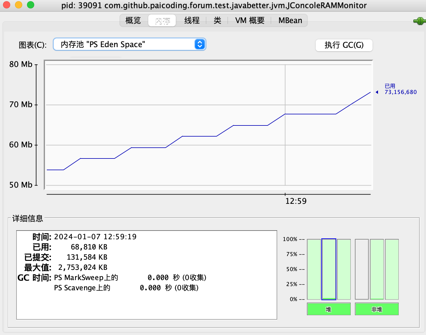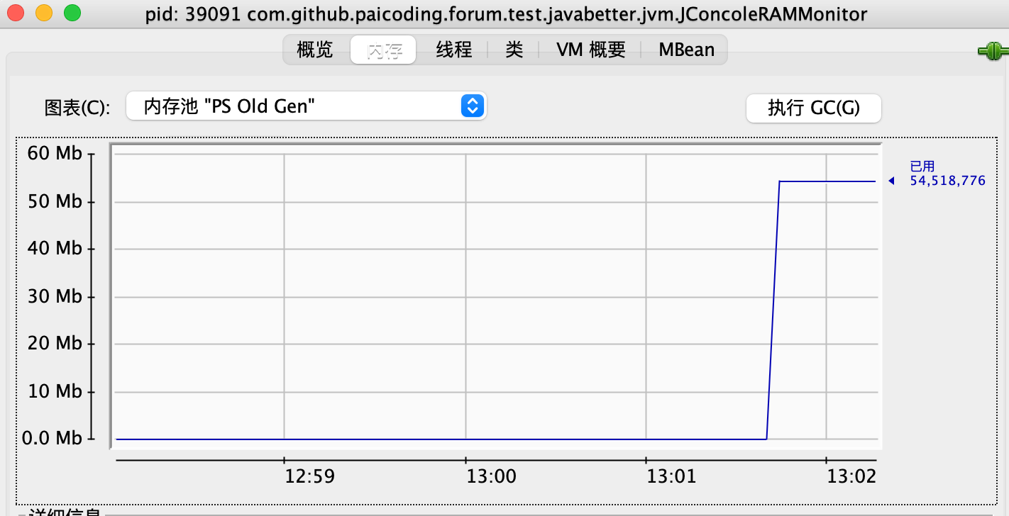 点击「执行 GC」之后,会发现老年代的柱状图会达到峰值状态,是因为执行 GC 之后,Eden 区的对象被回收,存活的对象被移动到老年代。