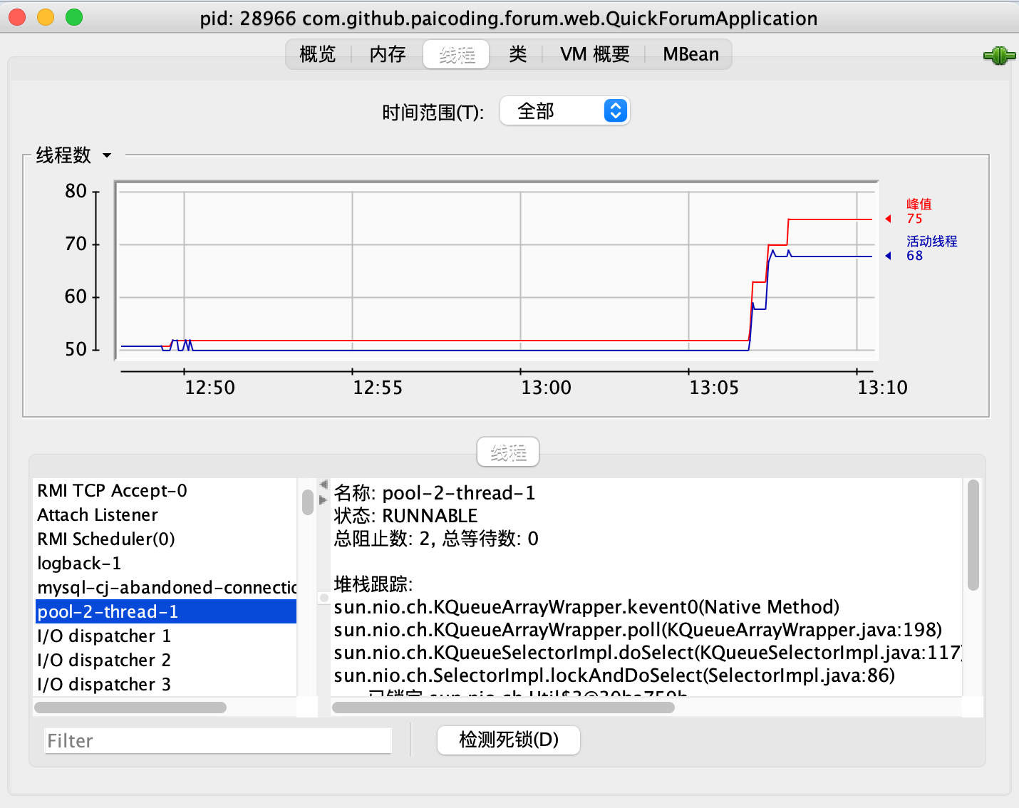 JConcole 还可以监控线程,相当于可视化的 jstack 命令(上一节讲过了)。