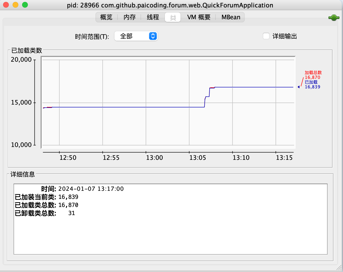 如下图,「类」面板显示了已经装载的类数量。在详细信息栏中,还显示了已经卸载的类的数量。
