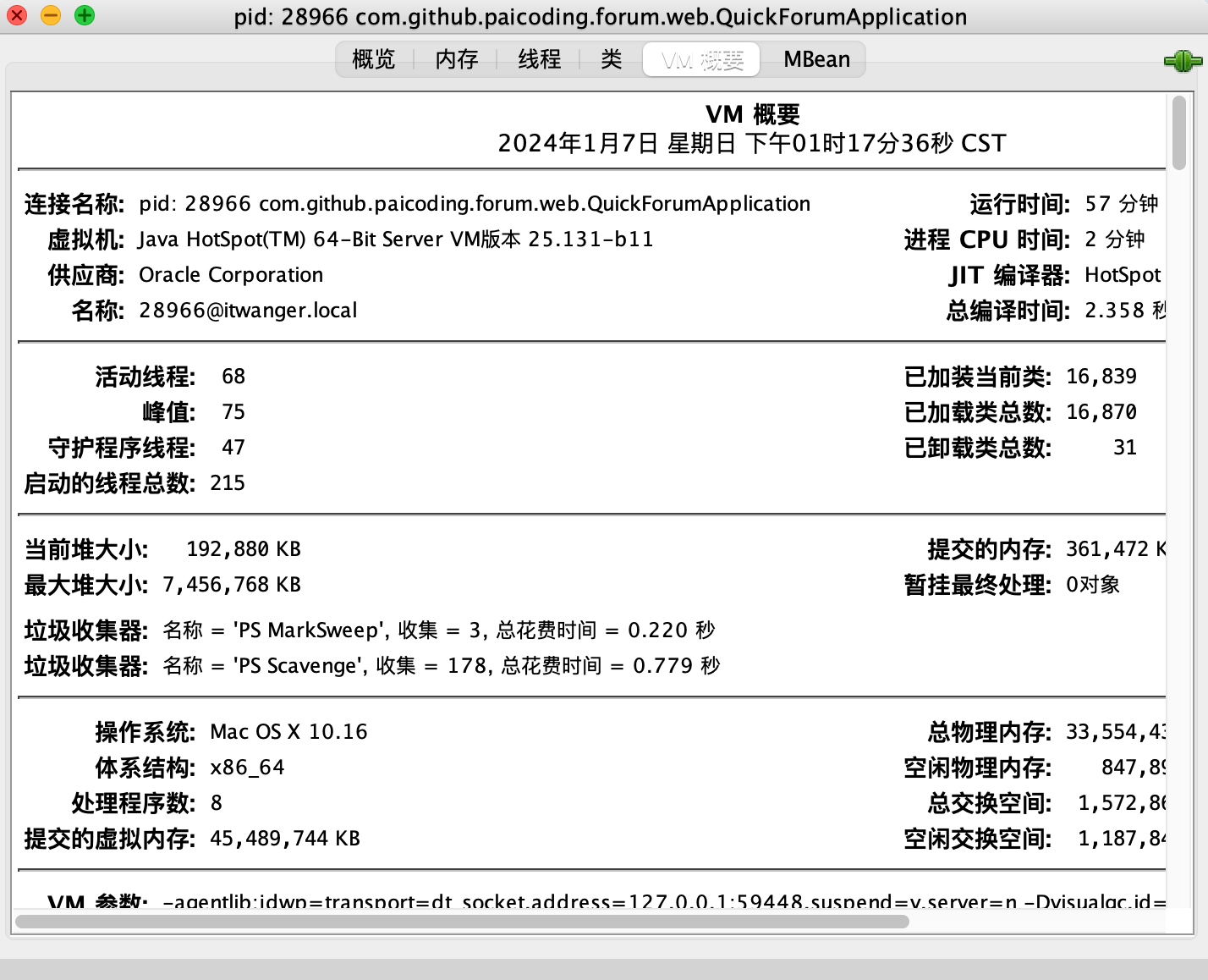 在VM 概要 面板,JConsole 显示了当前应用程序的运行时环境,包括虚拟机类型、版本、堆信息以及虚拟机参数等。
