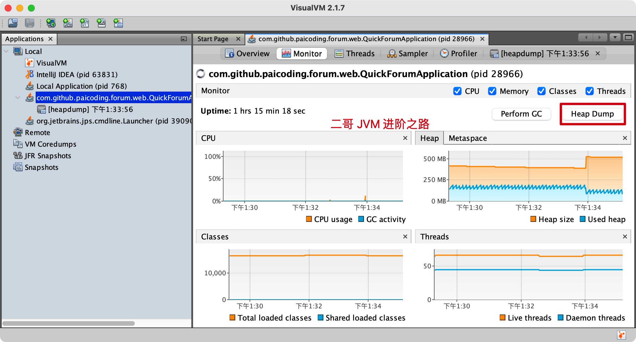 ②、在应用程序面板中选择应用程序,在“监视”面板中单击堆Dump。
