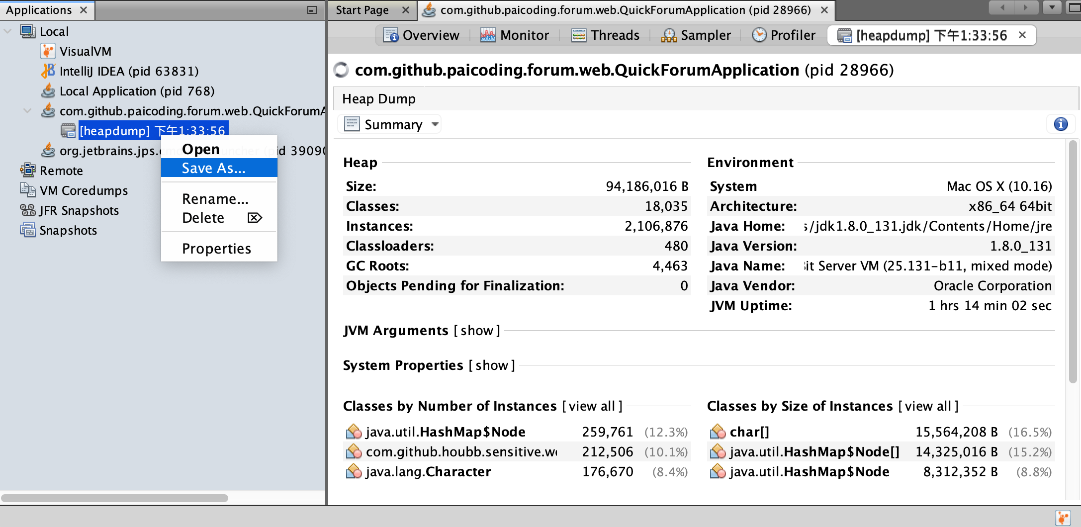 如果需要把堆转储快照保存文件后分享出去,可以在 heapdump 节点上右键选择“另存为”菜单,否则当 VisualVM 关闭时,生成的堆转储快照文件会被当作临时文件自动清理掉。