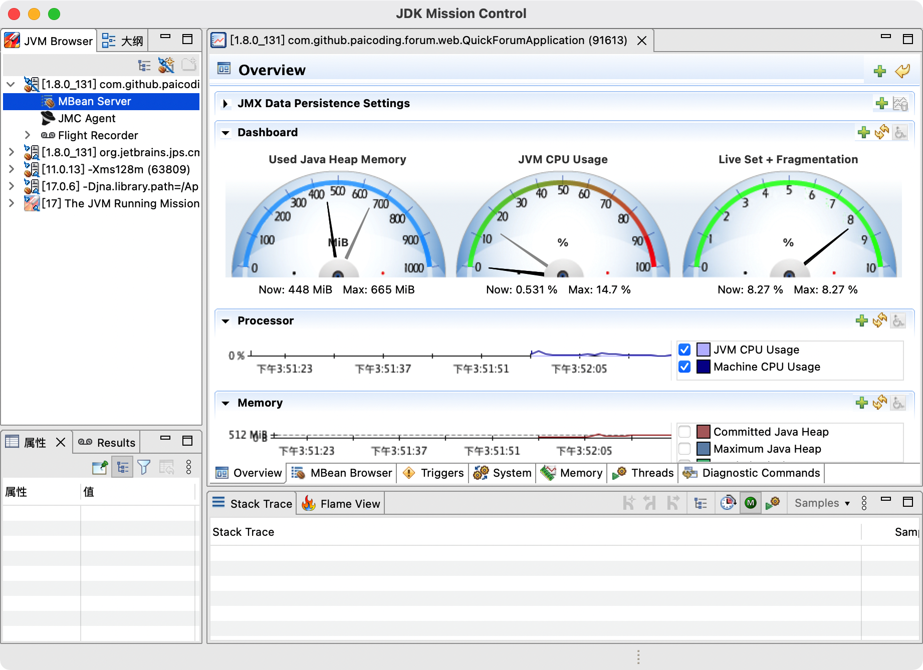 仪表盘显示了 Java 堆的使用率,CPU 使用率和 Live Set+Fragmentation(Live Set 是指存活对象的大小,Fragmentation 是指碎片的大小)。