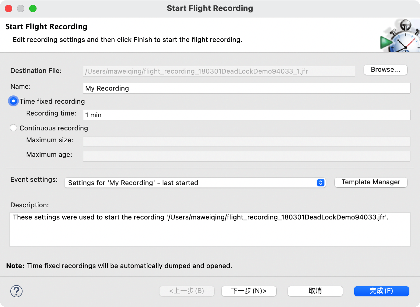 -XX:+UnlockCommercialFeatures -XX:+FlightRecorder连接加了相关参数启动的程序,启动飞行记录,进行一分钟的性能记录: