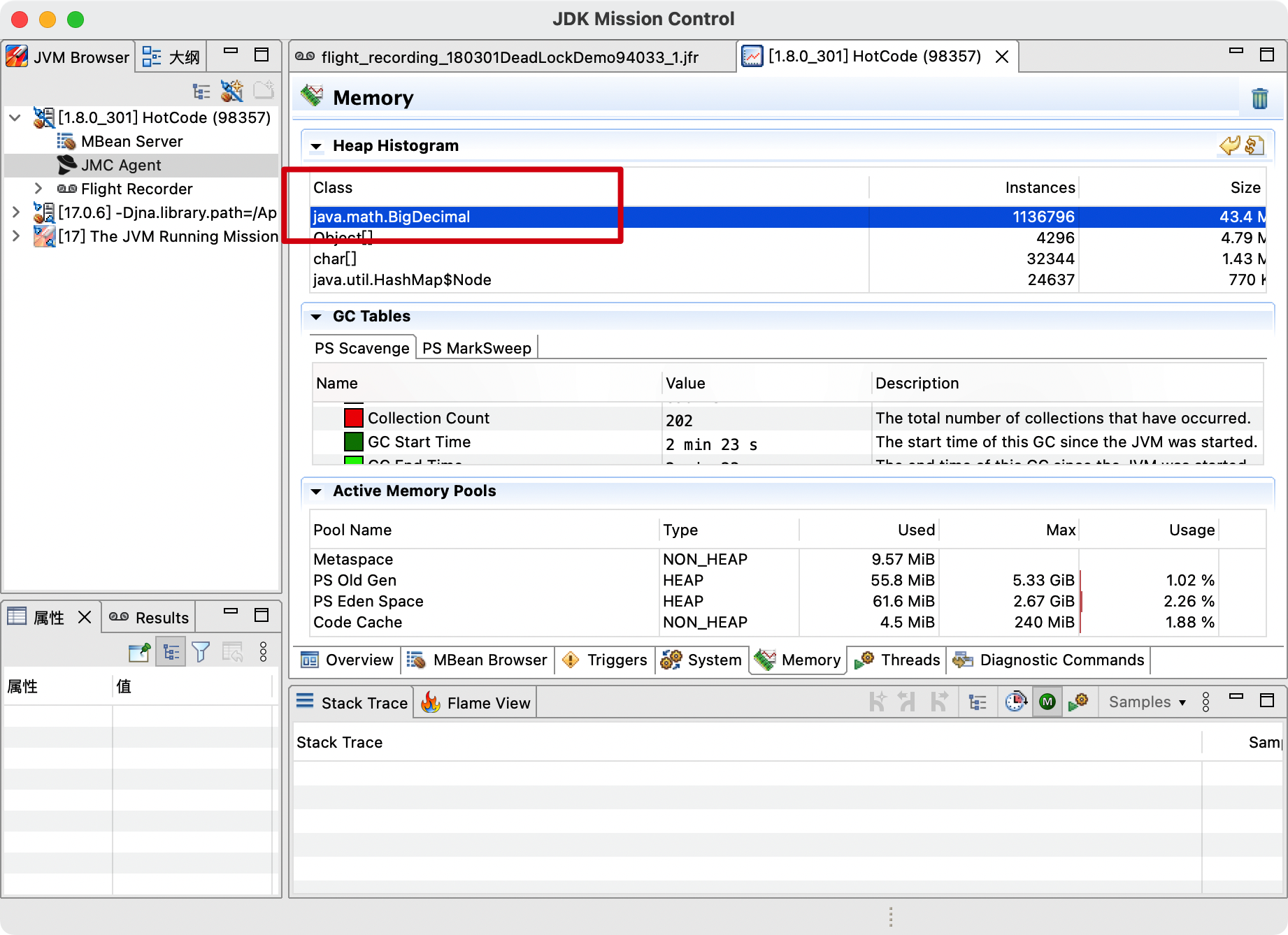 比如说通过「内存面板」可以看出 BigDecimal 对象占用了最多的内存。