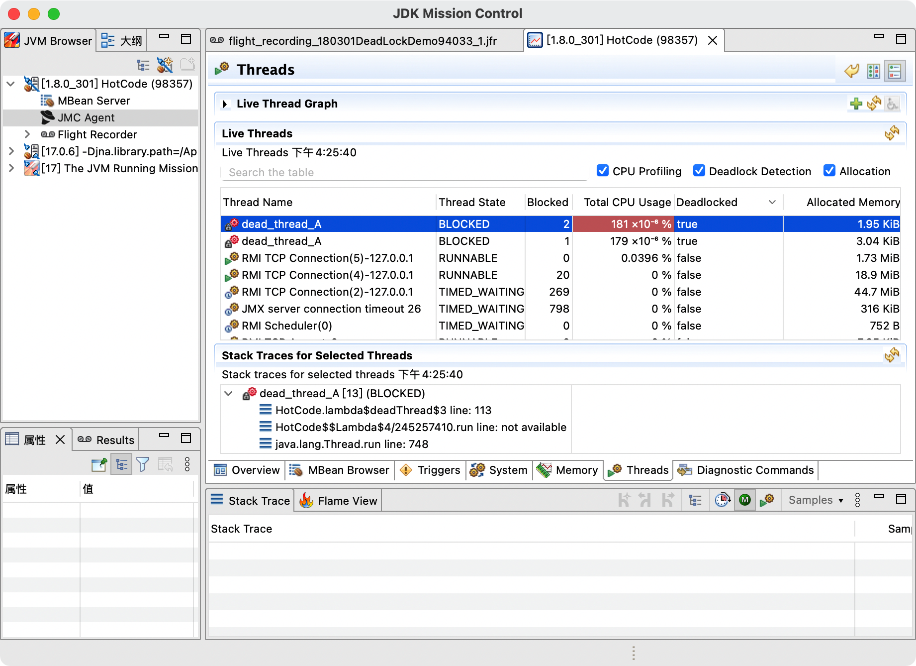 使用 JConsole 还可以快速定位死锁问题。上一篇我们曾写过一个死锁的例子,这里我们再来看一下。