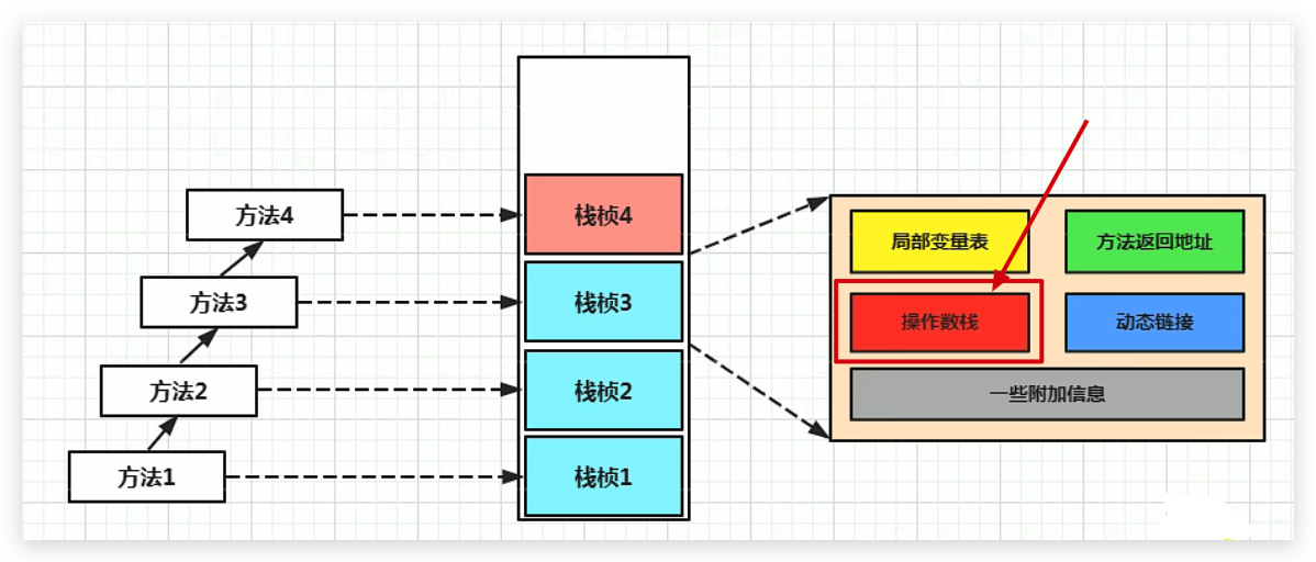 - 出栈:方法执行完成后,对应的栈帧会被移除,控制权回到前一个栈帧,前一个栈帧中的返回值成为当前活动栈帧的一个操作数,继续执行。