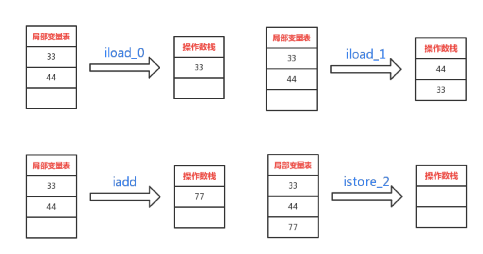 - iadd 将操作数栈中的 33 和 44 弹出,相加后将结果 77 压入操作数栈中