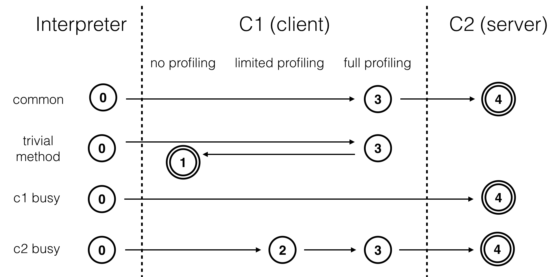 以上层次并不是固定不变的,根据不同的运行参数和版本,虚拟机可以调整分层的数量。各层次编译之间的交互转换关系如下图所示: