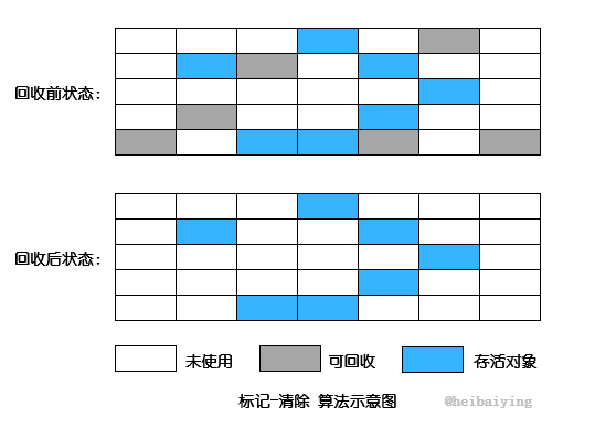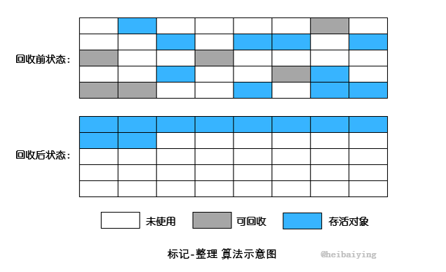 注:Java 堆是否规整取决于其采用的垃圾收集器是否带有空间压缩整理能力,前面讲过了。
