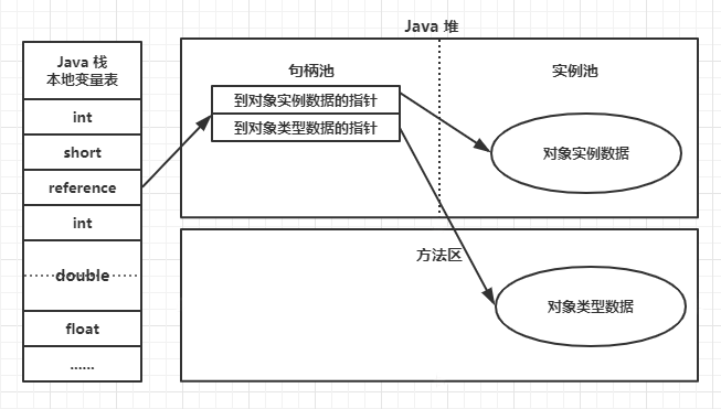 《Java 虚拟机规范》规定 reference 是一个指向对象的引用,但并未规定其具体实现方式。主流的方式方式有以下两种: