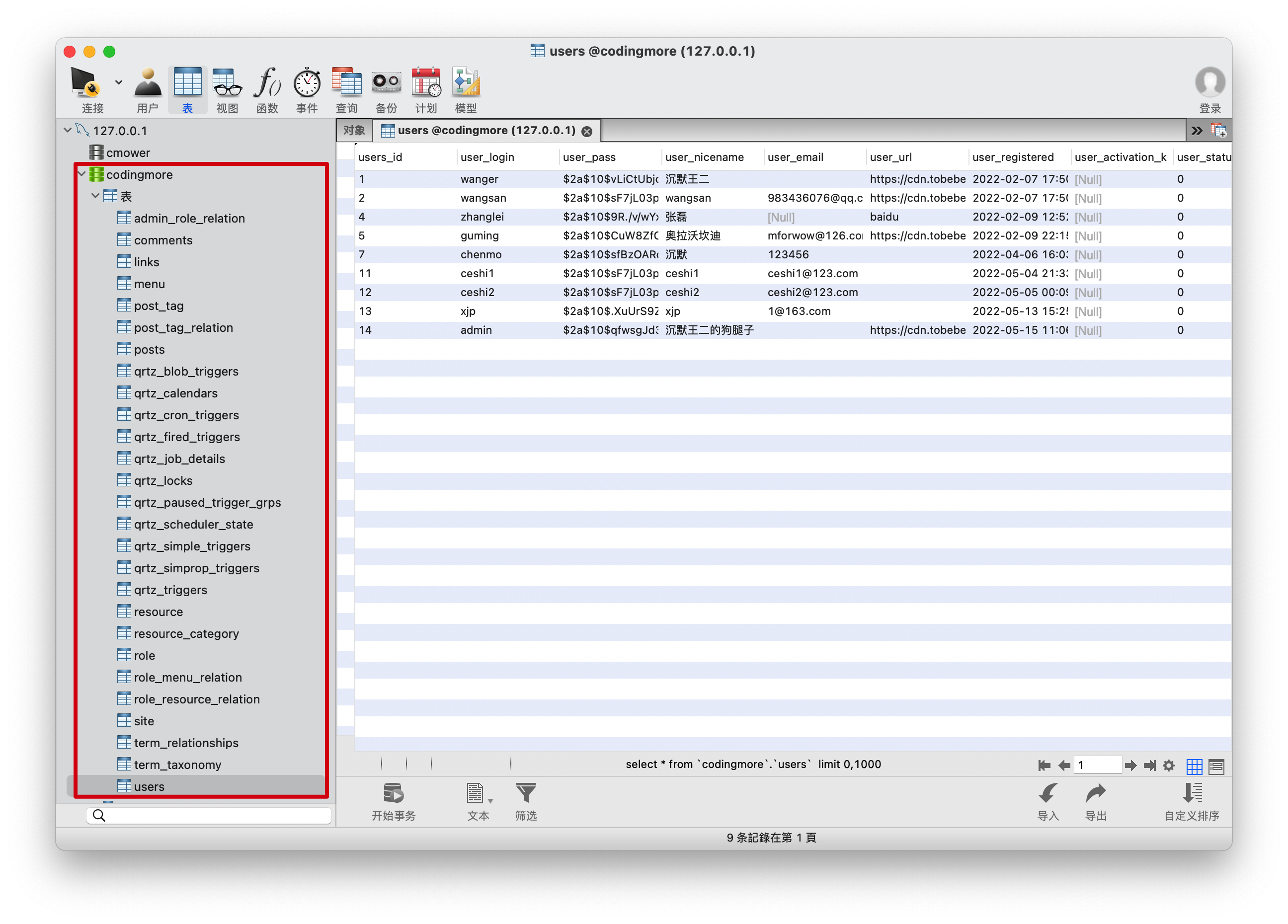 关闭链接,重新打开就可以看到导入后的数据库 codingmore,里面一共 27 张表。