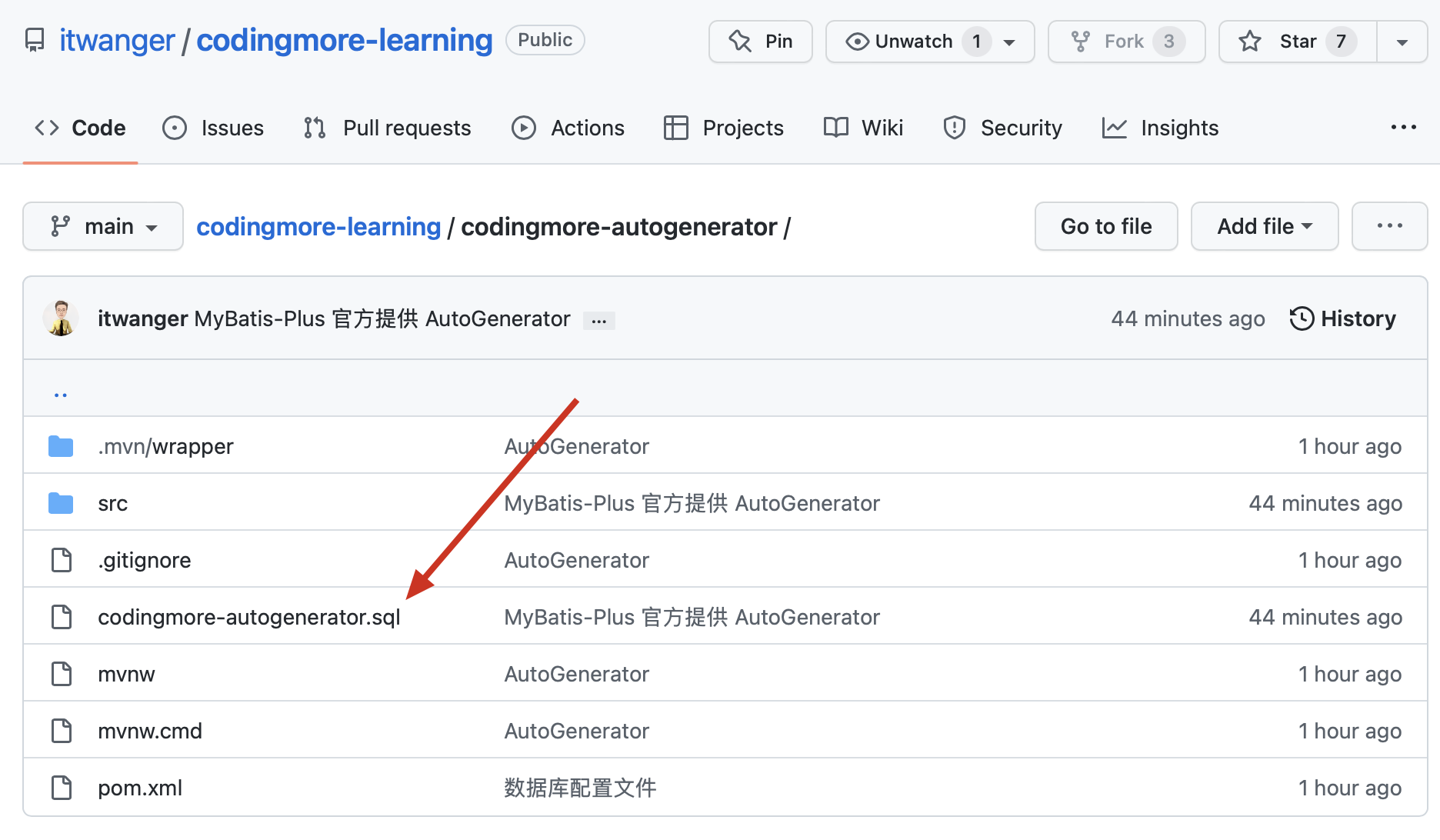 可以通过 GitHub 桌面版从 GitHub 上下载本教程专属的项目 codingmore-autogenerator 到本地,SQL 文件的位置参照下图。