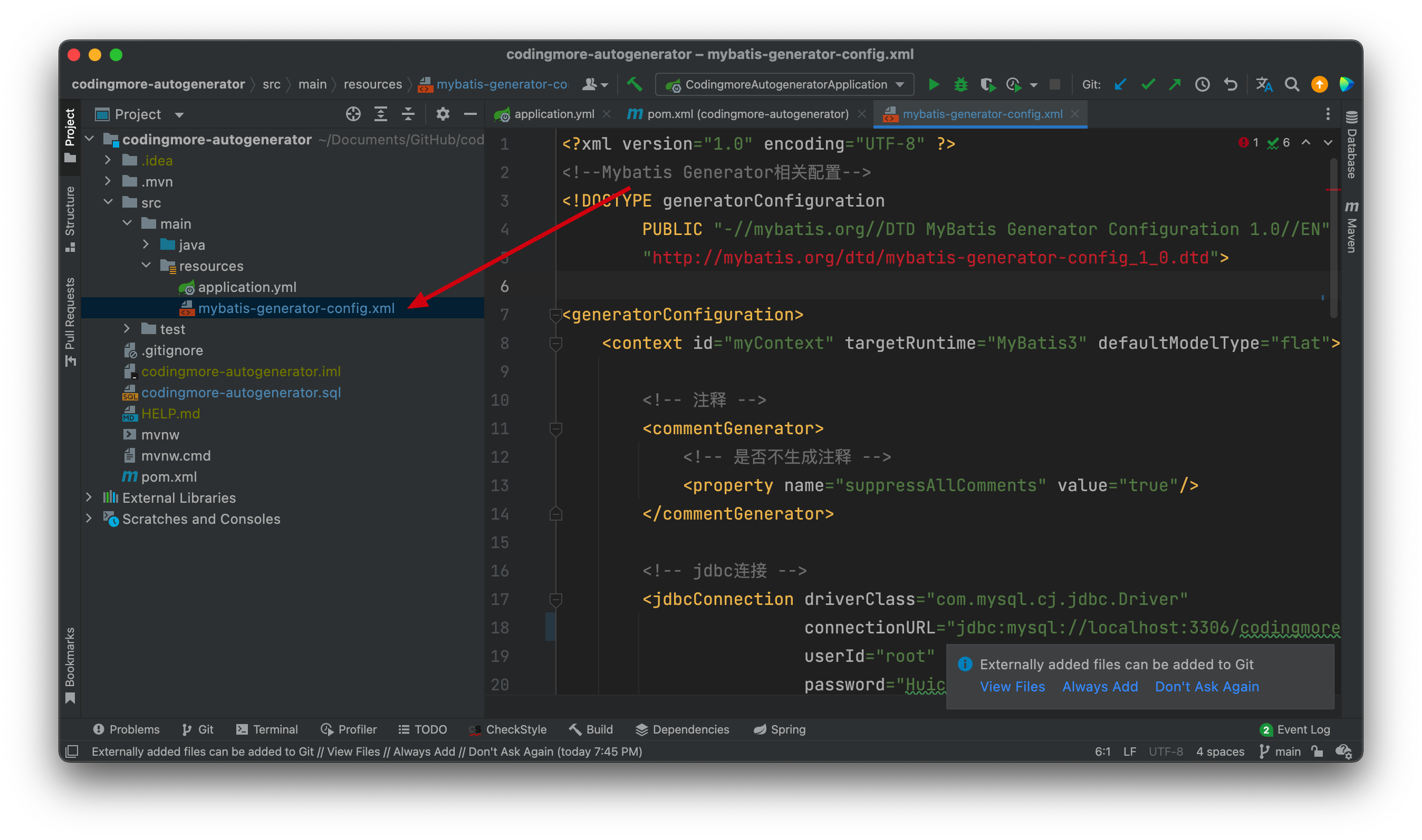 只添加插件还不够,还需要对其进行配置,我们使用 configurationFile 元素来指定一个配置文件 mybatis-generator-config.xml: