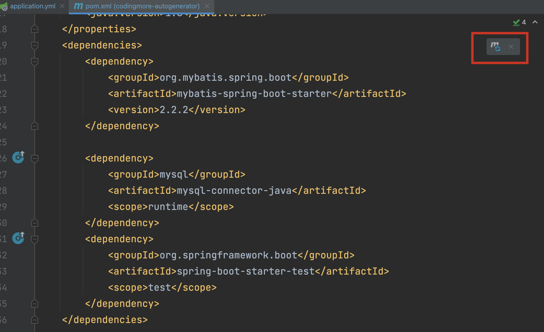 </dependency>添加完成后,一定要执行一次 Maven 重载(见下图),确保 MyBatis 的依赖加载完毕后再执行第二步。