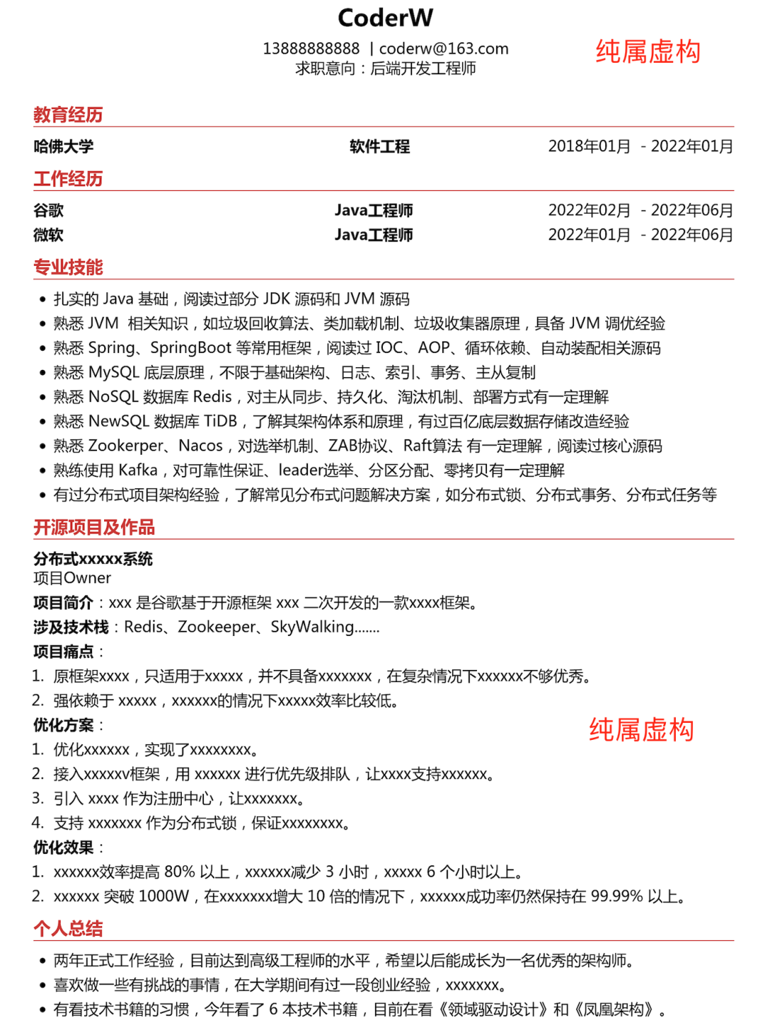 至于怎么写简历,我也不是专家,不说些花里花哨的,直接给一个我的简历模板吧,仅供参考。