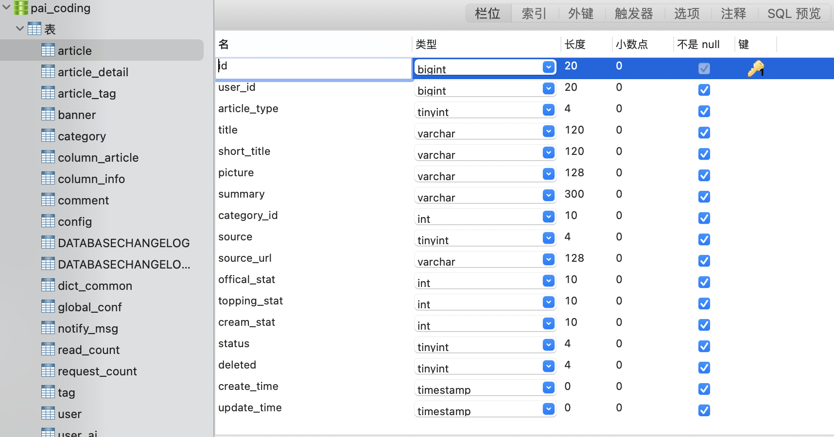 当我们要创建表的时候,就要根据业务需求,选择合适的数据类型。比如说在技术派实战项目当中,文章表就是由下面这些不同数据类型的字段定义的。