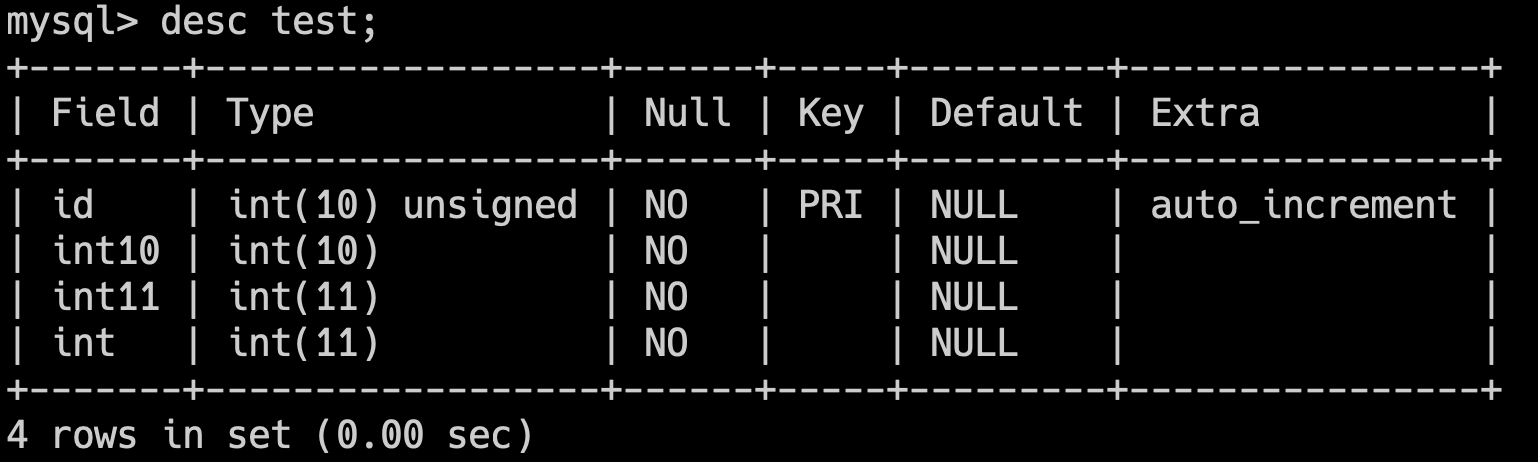 我们来创建这样一张测试表,包含四个字段,一个是主键 ID,一个是 int(10),一个是 int(11),另外一个是 int。