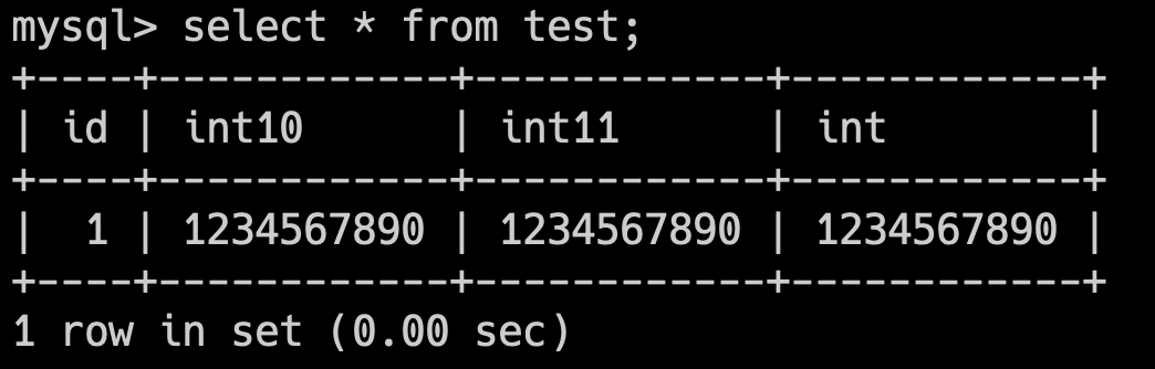 INSERT INTO `test` (`int10`, `int11`, `int`) VALUES (1234567890, 1234567890, 1234567890);查询一下,似乎没有什么区别。