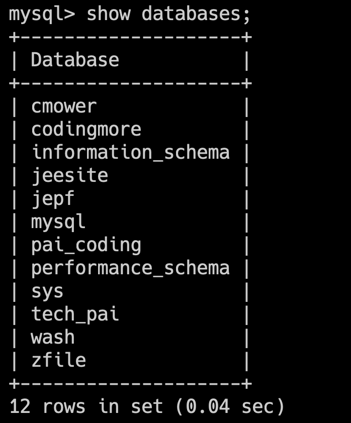 OK,像上面截图中的 information_schema、mysql、performance_schema、sys 这些都是 MySQL 自带的数据库,剩余的 cmower、codingmore、jeesite、jepf、pai_coding 等都是我本地创建的数据库,这些数据库名大家很容易就联系到某些有点名气的开源项目,比如说技术派。