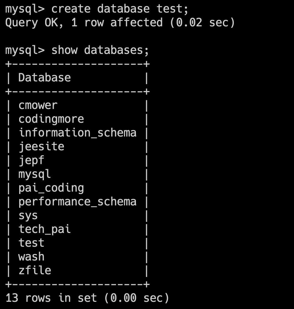 create database test;如果提示 Query OK, 1 row affected (0.02 sec),说明数据库创建成功了。