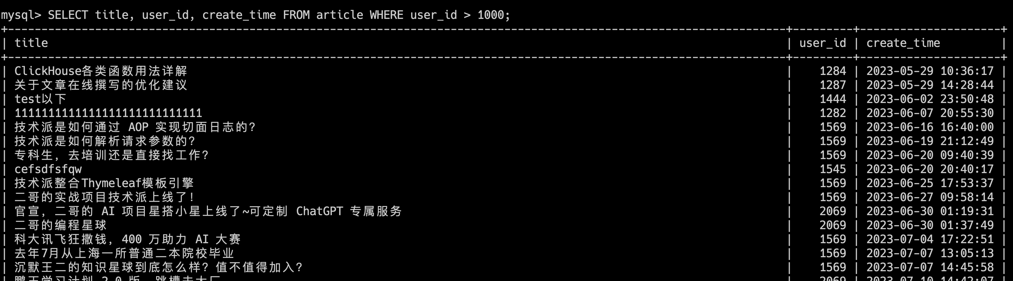 SELECT title, user_id, create_time FROM article WHERE user_id > 1000;