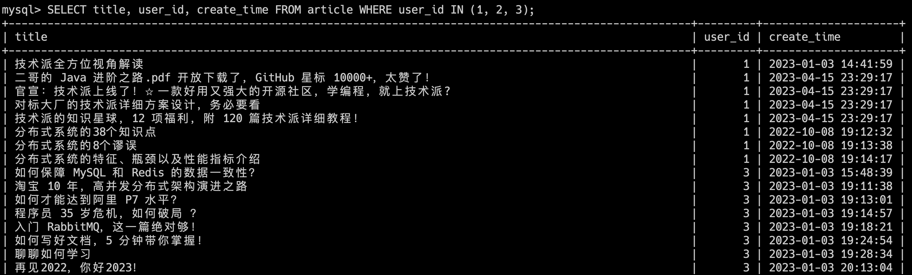 SELECT title, user_id, create_time FROM article WHERE user_id IN (1, 2, 3);只要匹配到枚举中的任意一个值,就会被查询出来。