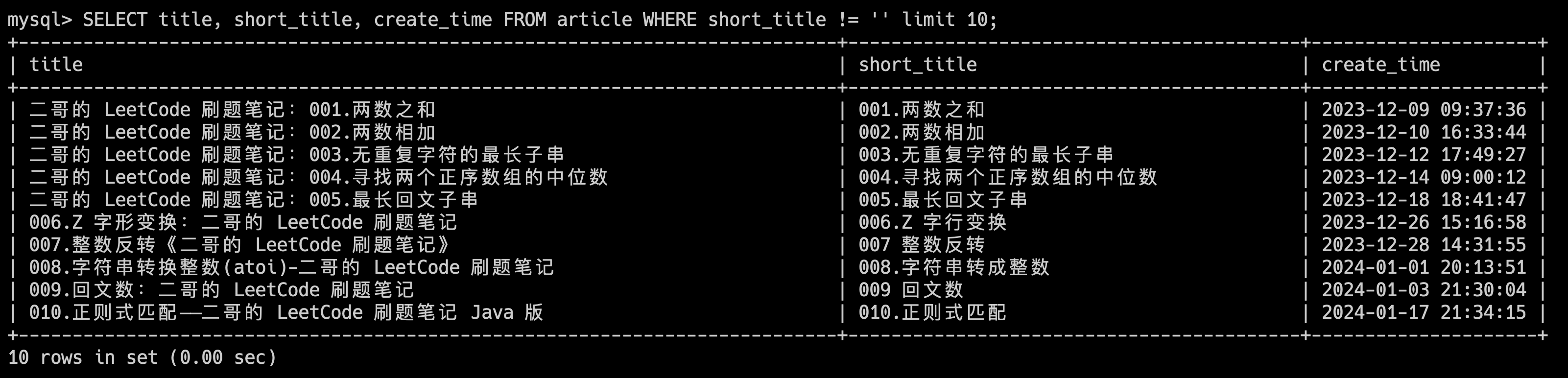 SELECT title, short_title, create_time FROM article WHERE short_title IS NULL;不为 NULL 的文章,可以这么写: