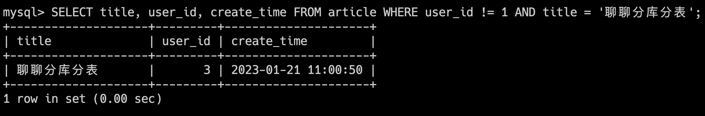 SELECT title, user_id, create_time FROM article WHERE user_id != 1 AND title = '聊聊分库分表';