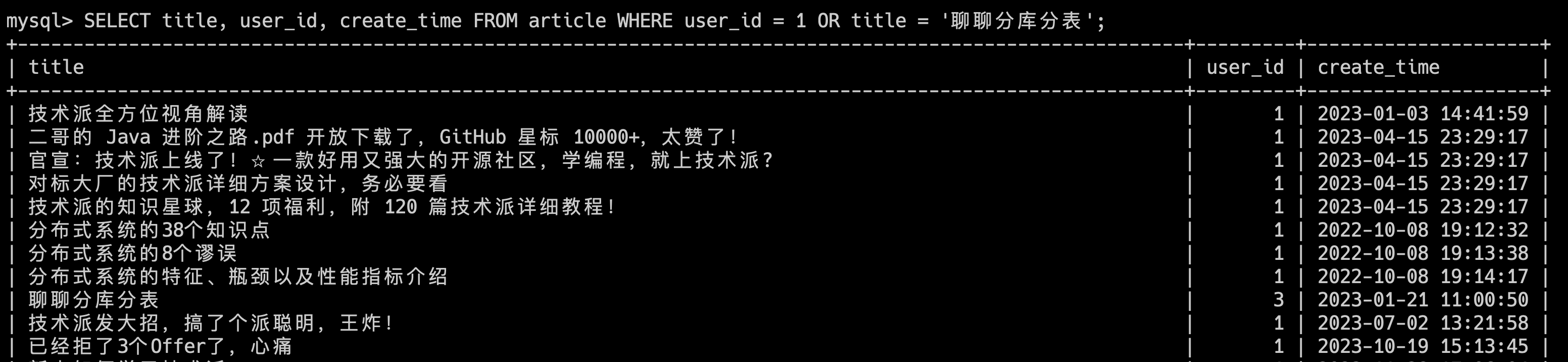 SELECT title, user_id, create_time FROM article WHERE user_id = 1 OR title = '聊聊分库分表';