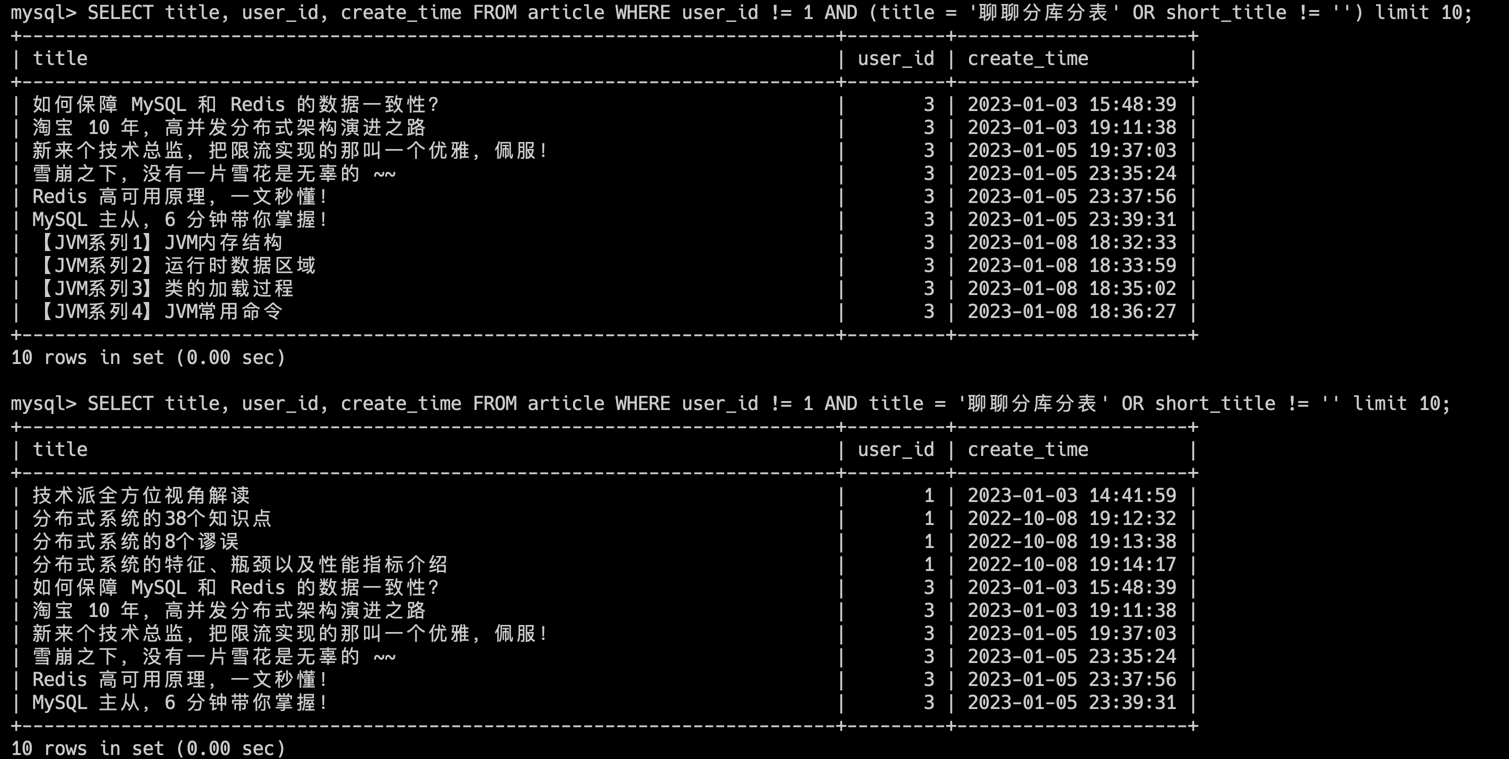 SELECT title, user_id, create_time FROM article WHERE user_id != 1 AND (title = '聊聊分库分表' OR short_title != '');对比一下有小括号和没有小括号的查询结果,是完全不一样的,因为逻辑的先后顺序不同,这个大家都能懂: