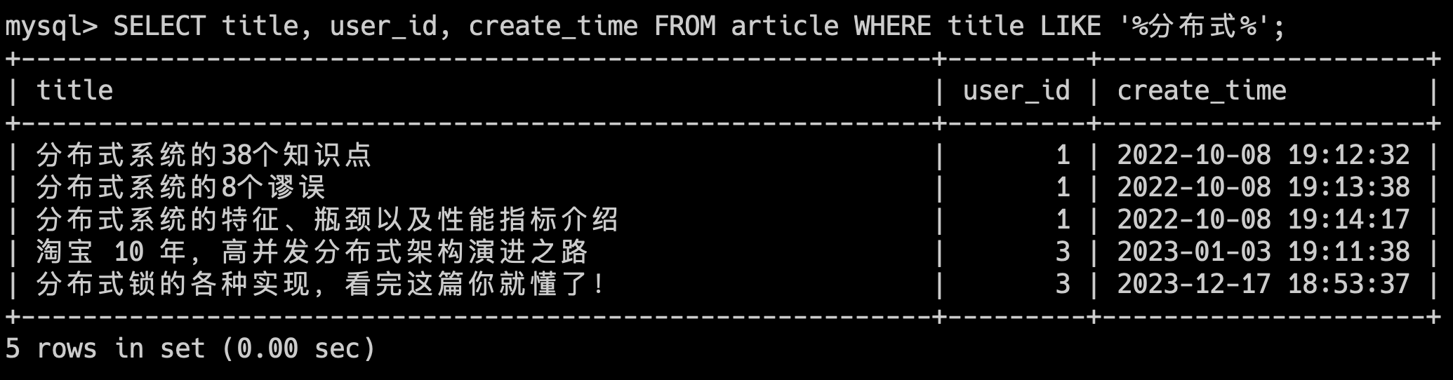 SELECT title, user_id, create_time FROM article WHERE title LIKE '%分布式%';LIKE 关键字用于模糊查询,之前用到的 = 属于精确查询。