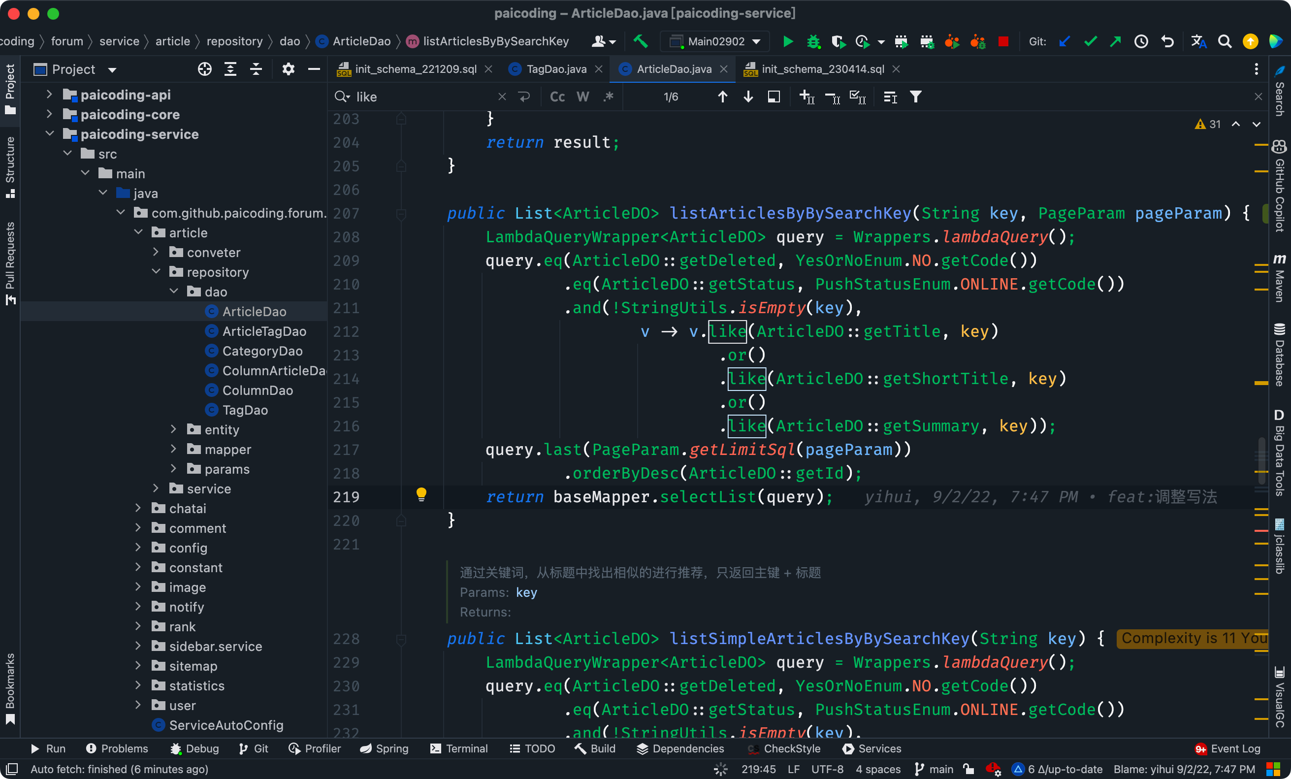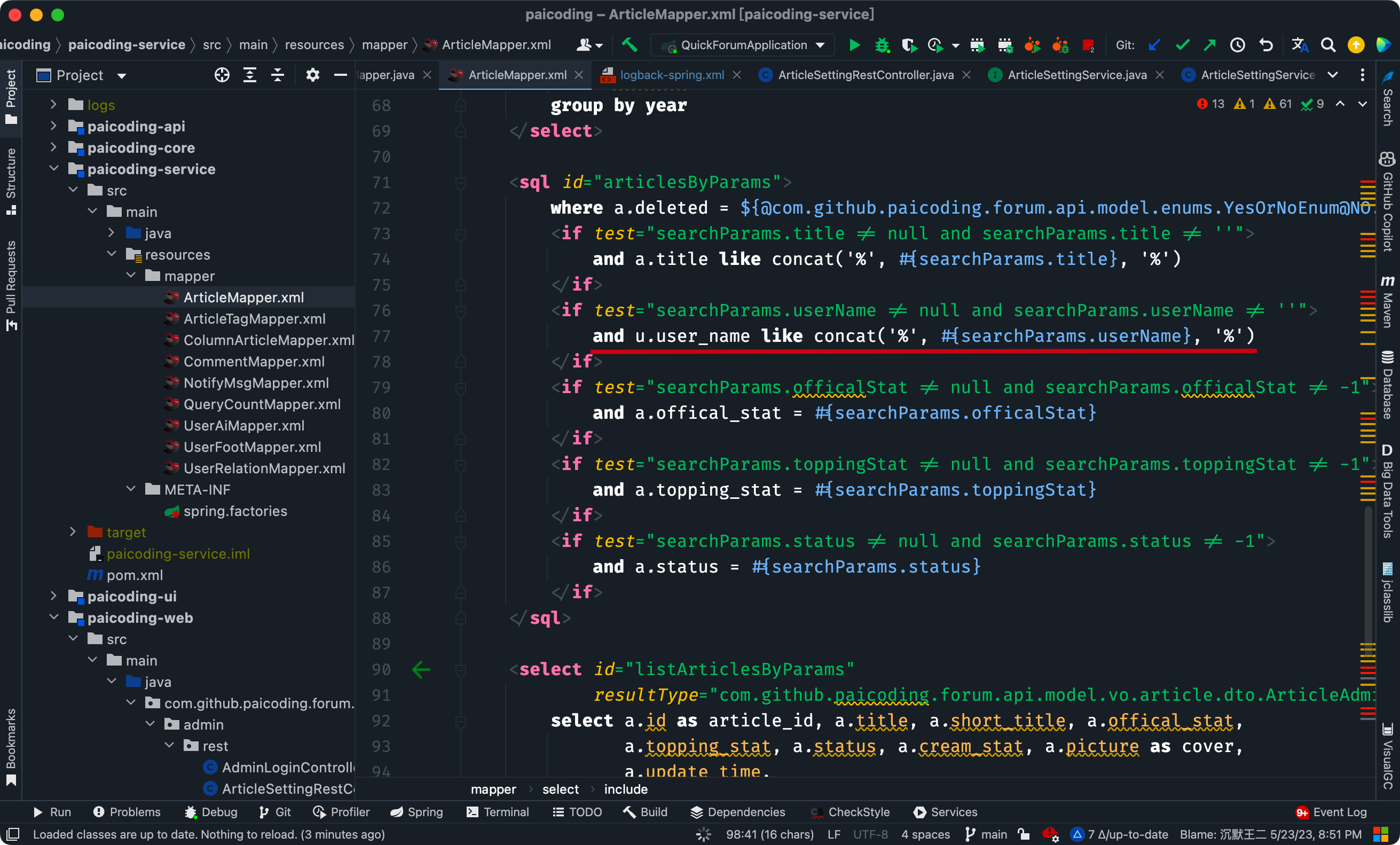 通常会在 Mapper.xml 文件中进行 SQL 语句的定义和拼接,比如说技术派的 admin 端在查询文章的时候,就是通过自定义 SQL 来实现模糊查询的。