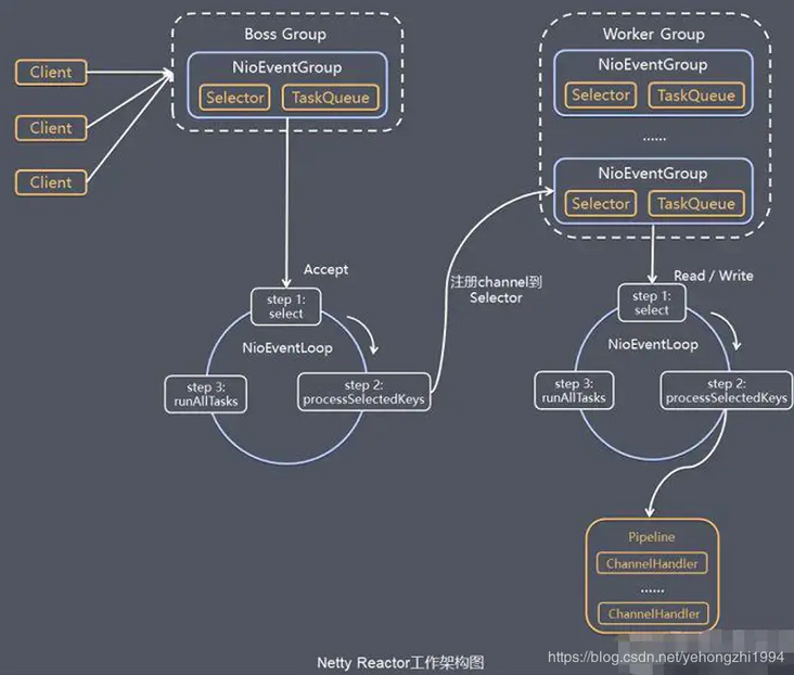 每个EventLoopGroup里包括一个或多个EventLoop,每个EventLoop中维护一个Selector实例。