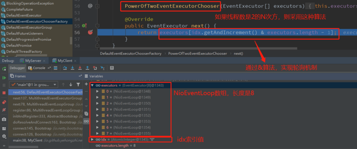 它这里还有一个判断,如果线程数不是2的N次方,则采用取模算法实现。