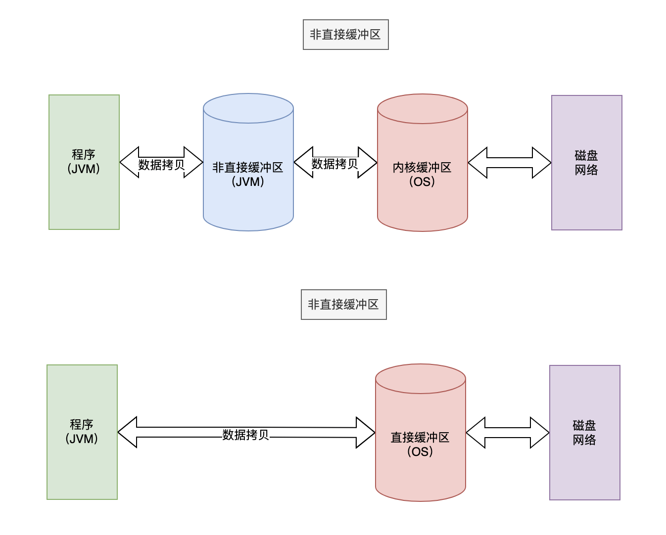 非直接缓冲区存储在JVM内部,数据需要从应用程序(Java)复制到非直接缓冲区,再复制到内核缓冲区,最后发送到设备(磁盘/网络)。而对于直接缓冲区,数据可以直接从应用程序(Java)复制到内核缓冲区,无需经过JVM的非直接缓冲区。