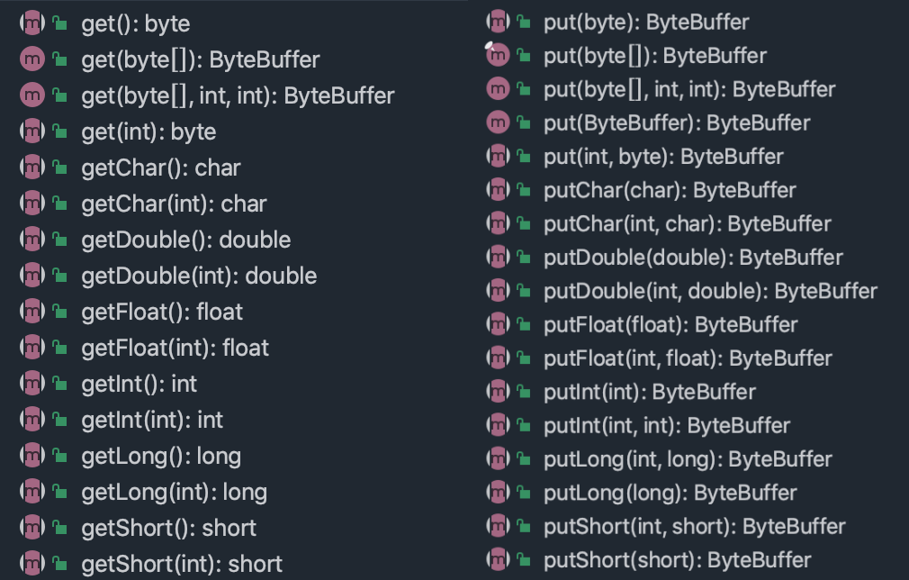 拿到一个缓冲区我们往往会做什么?很简单,就是读取缓冲区的数据/写数据到缓冲区中。所以,缓冲区的核心方法就是 put 和 get: