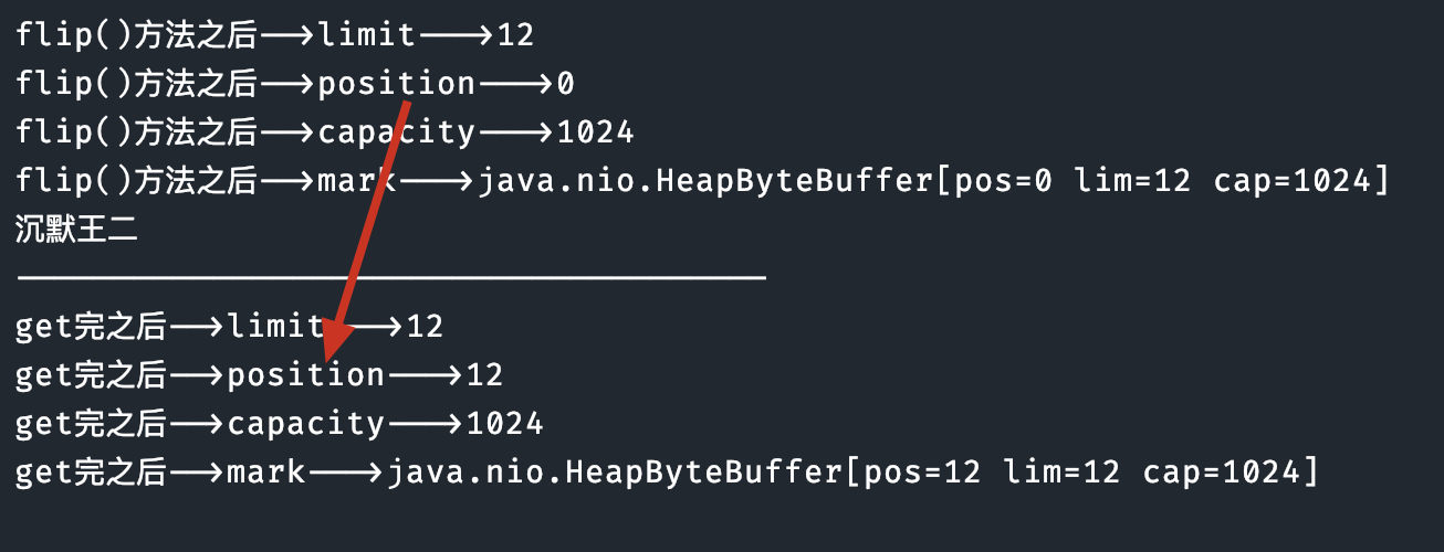 put完之后-->mark--->java.nio.HeapByteBuffer[pos=12 lim=1024 cap=1024]现在我想要从缓存区拿数据,怎么拿呀??NIO 给了我们一个flip()方法。这个方法可以改动 position 和 limit 的位置!
