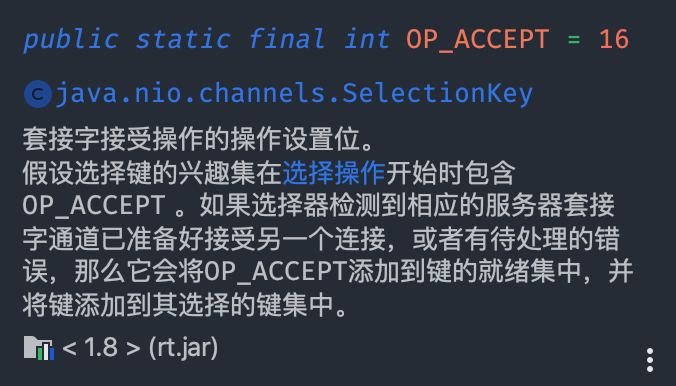 serverSocketChannel.register(selector, SelectionKey.OP_ACCEPT);看一下 OP_ACCEPT 的注释: