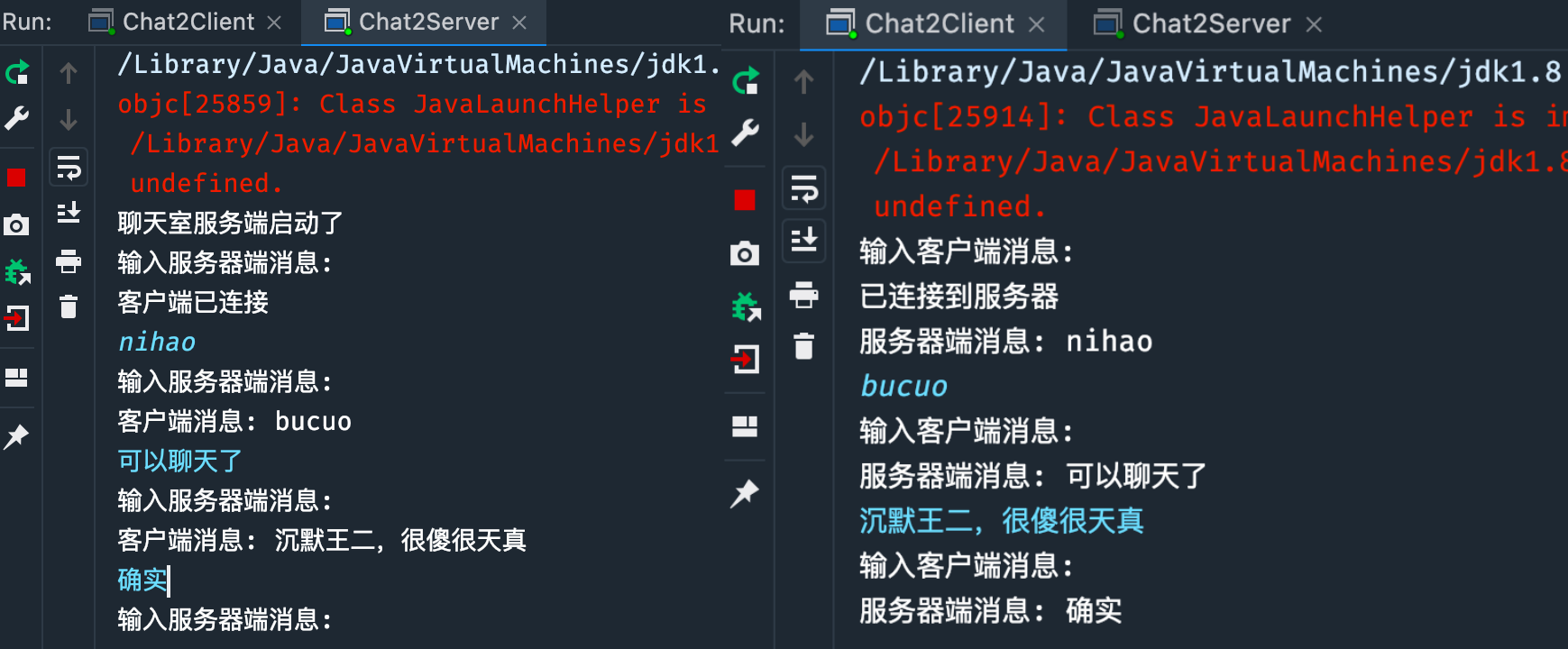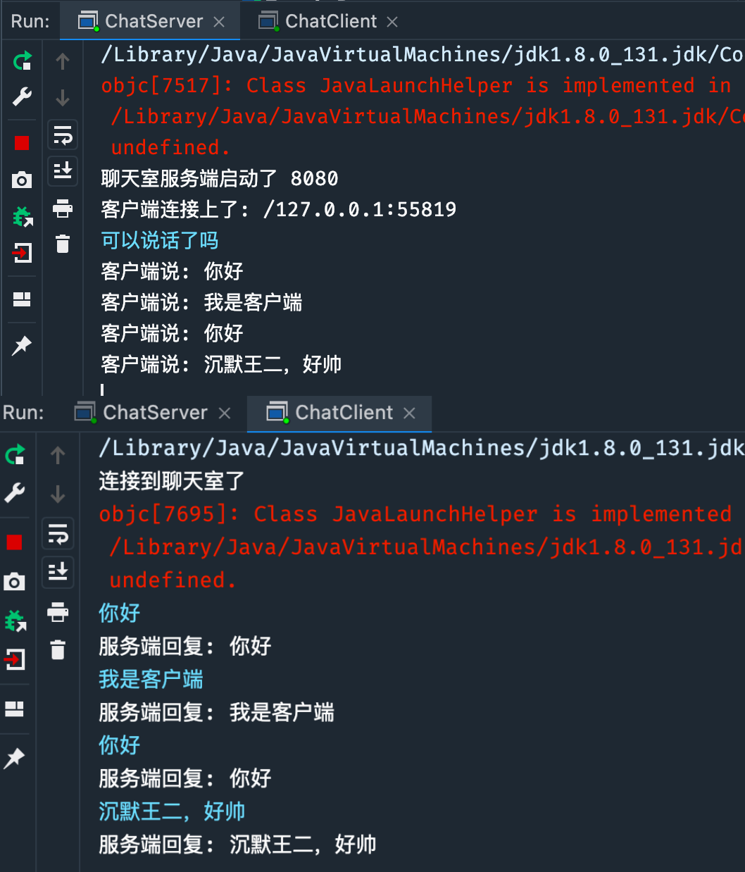}运行 Server,再运行 Client,交互信息如下: