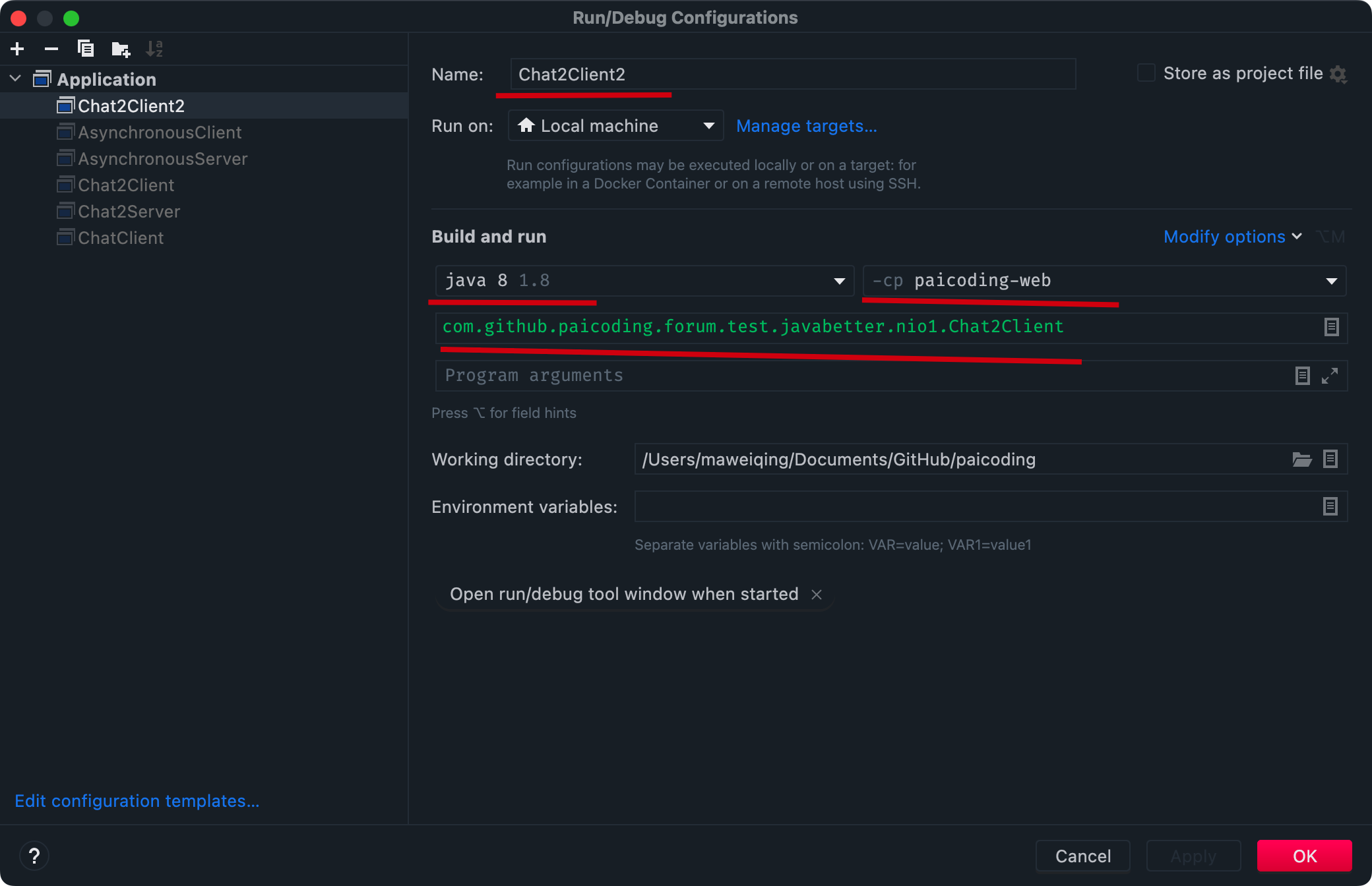 我们使用了 Selector 和非阻塞 I/O,这使得服务器可以同时处理多个连接。所以我们在 Intellij IDEA 中可以再配置一个客户端,见下图(填上这四项内容)。