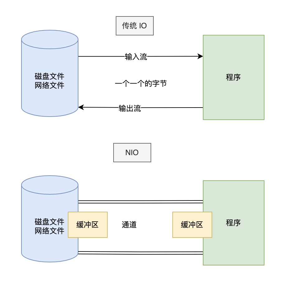 我这里先给大家展示一副传统 IO 和 NIO 的对比图,感受一下。