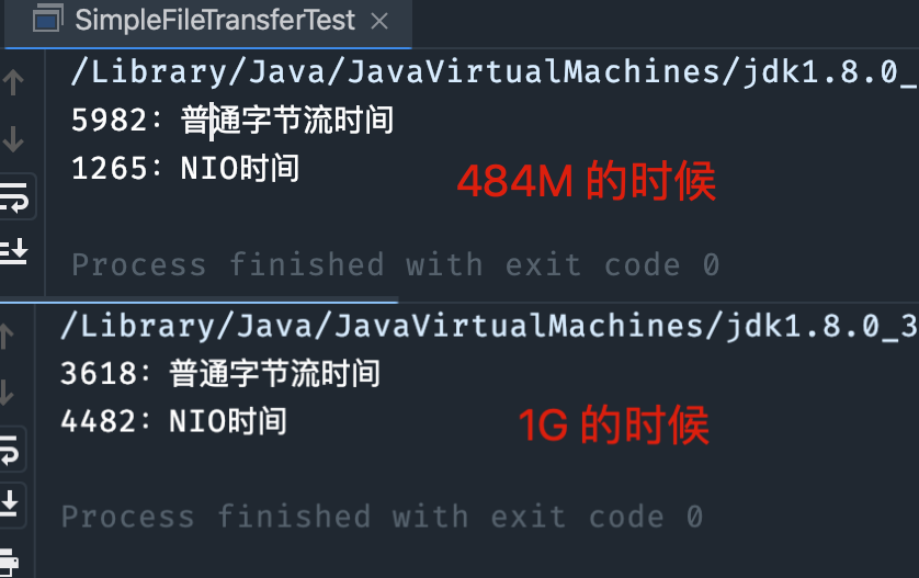 long timeNio = simpleFileTransferTest.transferFileWithNIO(sourse, nio);