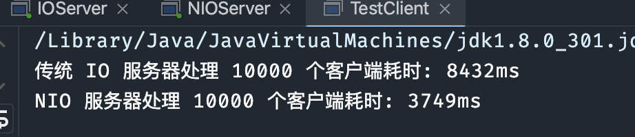 System.out.println("NIO 服务器处理 " + clientCount + " 个客户端耗时: " + (endTime - startTime) + "ms");