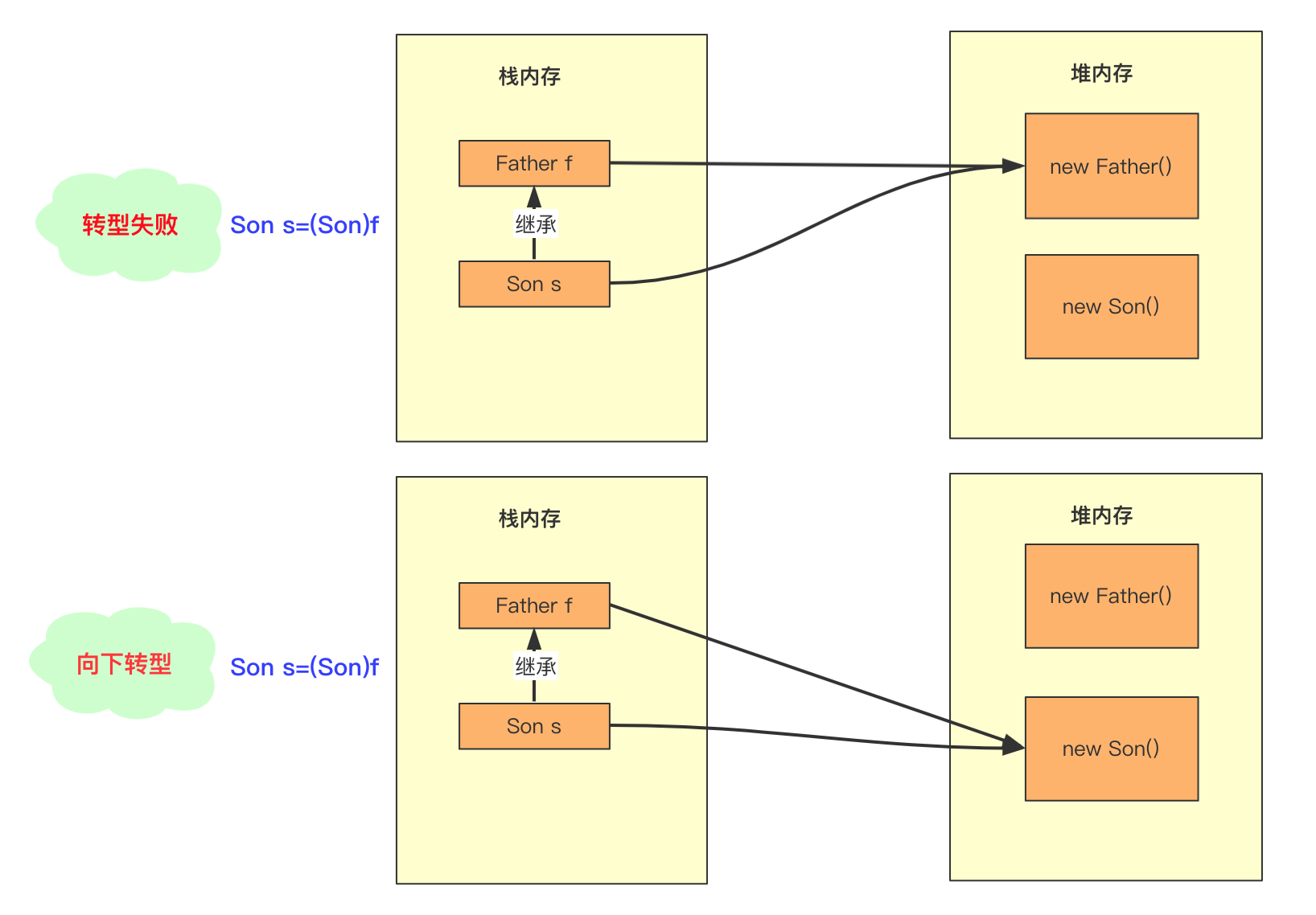 向下转型是指将父类引用强转为子类类型;这是不安全的,因为有的时候,父类引用指向的是父类对象,向下转型就会抛出 ClassCastException,表示类型转换失败;但如果父类引用指向的是子类对象,那么向下转型就是成功的。