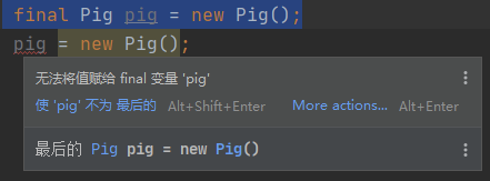 final Pig pig = new Pig();“如果尝试将 pig 重新赋值的话,编译器同样会生气。”