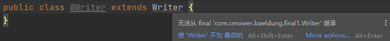 }“尝试去继承它,编译器会提示以下错误,Writer 类是 final 的,无法继承。”