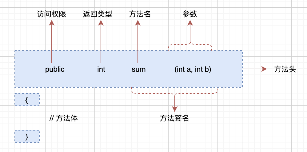 方法体:方法体放在一对花括号内,把一些代码放在一起,用来执行特定的任务。